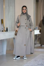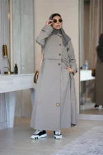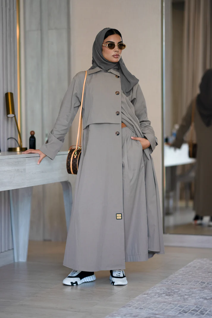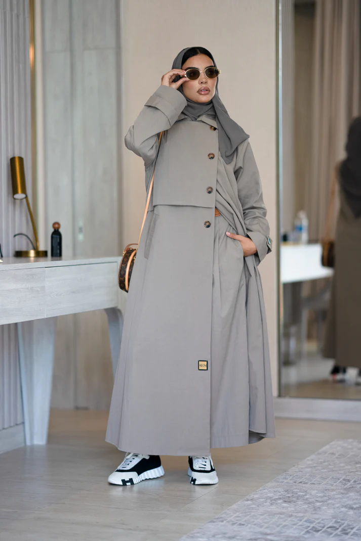 بليزر مصنوع من قماش الترنش المريح، مناسب لجميع الفصول. تتميز العباية بأزرار على الجانبين وعلى الأكمام، مع قصة واسعة لمزيد من الأناقة. إضافة القماش وزر على الكتف يزيد من أناقتها.