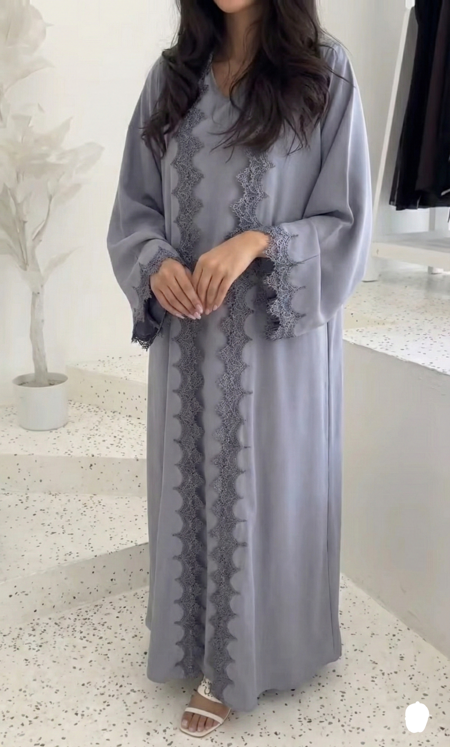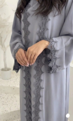 تألقي بإطلالة تجمع بين النعومة والفخامة مع هذه العباية الرمادية الساحرة. مُصممة خصيصاً للمرأة العصرية التي تبحث عن الراحة دون التنازل عن الأناقة، ومزينة بتفاصيل دانتيل دقيقة على الأطراف والأكمام لتمنحكِ حضوراً مميزاً في كل الأوقات.