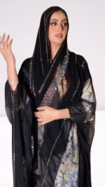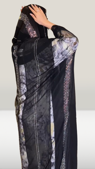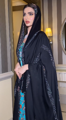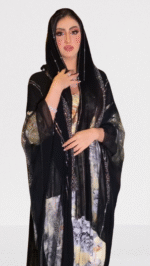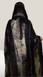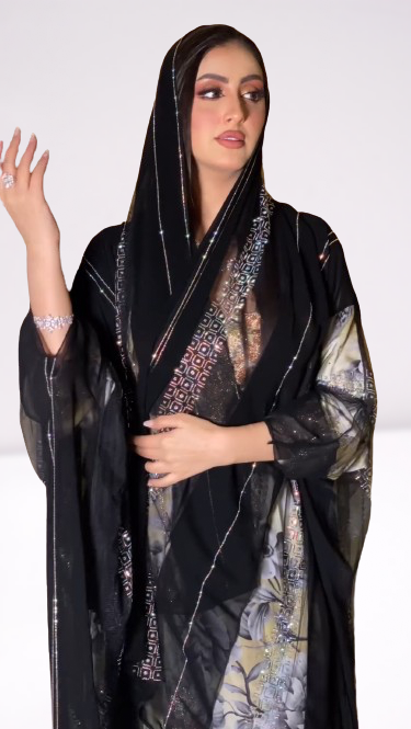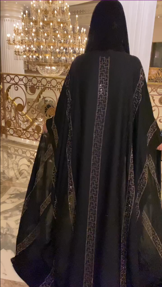 ارتقِ بأناقتك مع هذه العباءة السوداء المذهلة، التي تتميز بتطريز هندسي معقد على طول الحواف لإضفاء لمسة راقية. يضفي القماش شبه الشفاف إحساسًا خفيفًا وخفيف الوزن، بينما توفر التفاصيل الزهرية النابضة بالحياة في الأسفل تباينًا جميلًا بين الأنوثة العصرية والرشاقة الخالدة. مثالية للتجمعات الرسمية أو المناسبات الخاصة، تجمع هذه العباءة بين التقليد والأسلوب المعاصر بكل سهولة.
