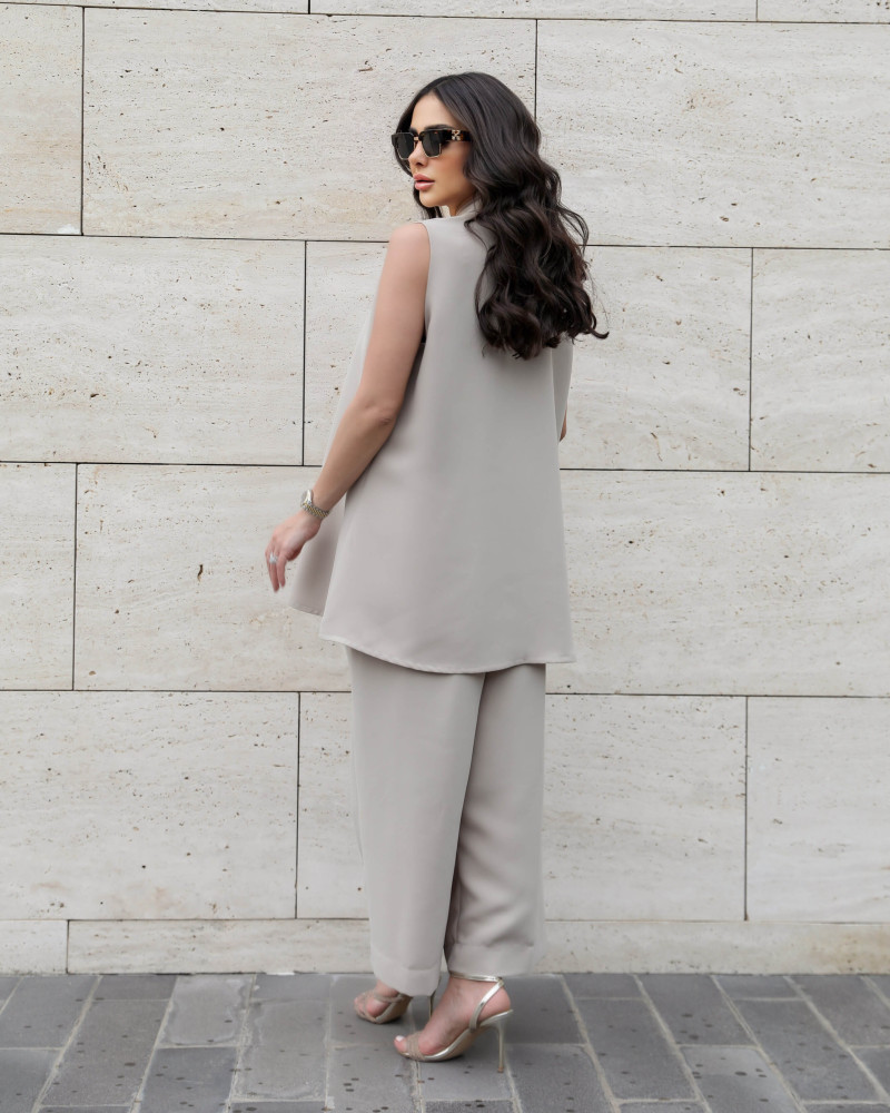 Achieve a refined and polished look with this sleek beige vest and pant set, crafted with precision and a smooth, luxurious finish. The tailored design provides a flattering silhouette, while the soft fabric ensures ultimate comfort and ease of movement. The minimalist style makes it perfect for both casual outings and formal events. Complete your outfit with accessories to elevate the look and embody timeless sophistication.