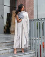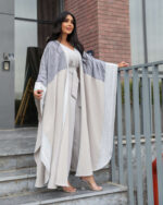 Radiate elegance with this chic abaya in soft beige, featuring a beautifully textured grey panel for a modern twist. The flowing silhouette is enhanced with intricate embroidery along the edges, adding a touch of sophistication to the design. Perfect for both formal events and everyday wear, this abaya exudes timeless charm and contemporary style. Complete your look with minimal accessories for effortless grace